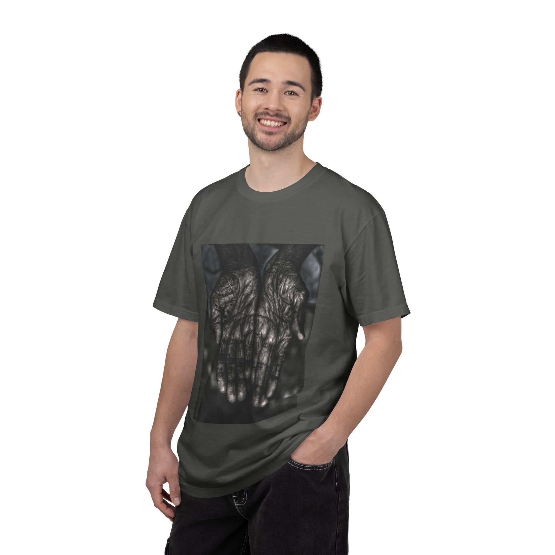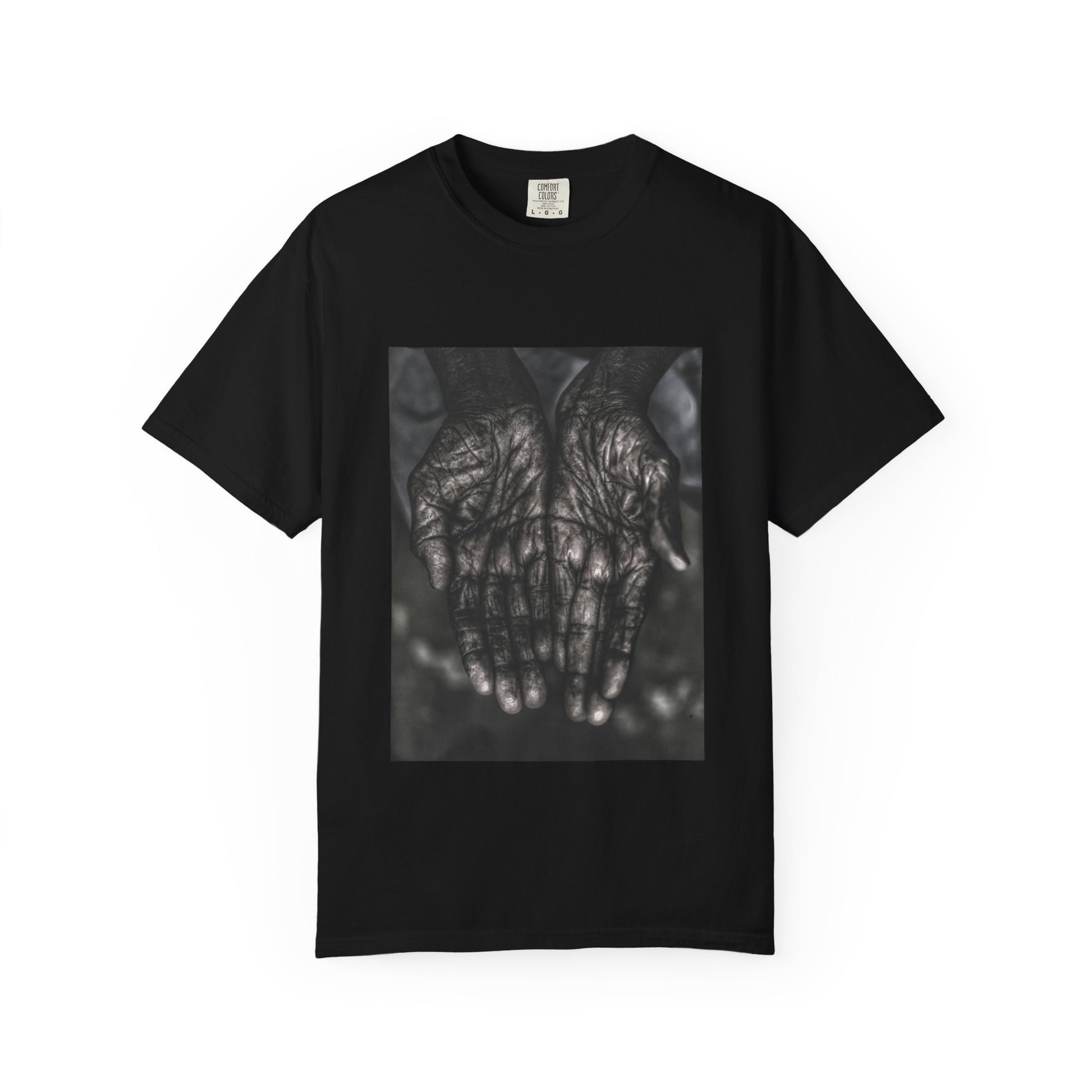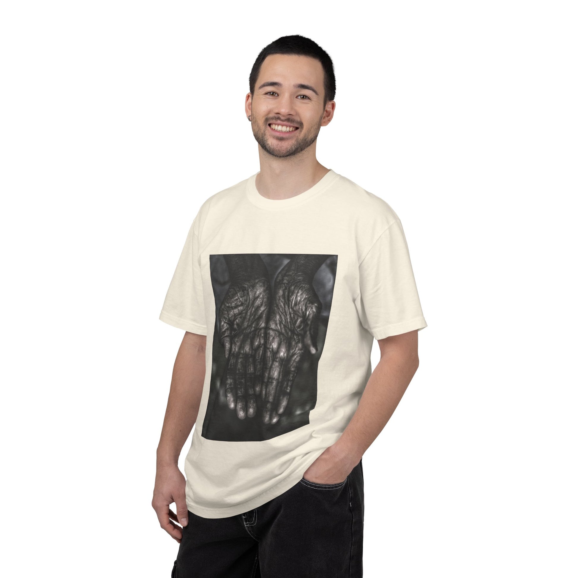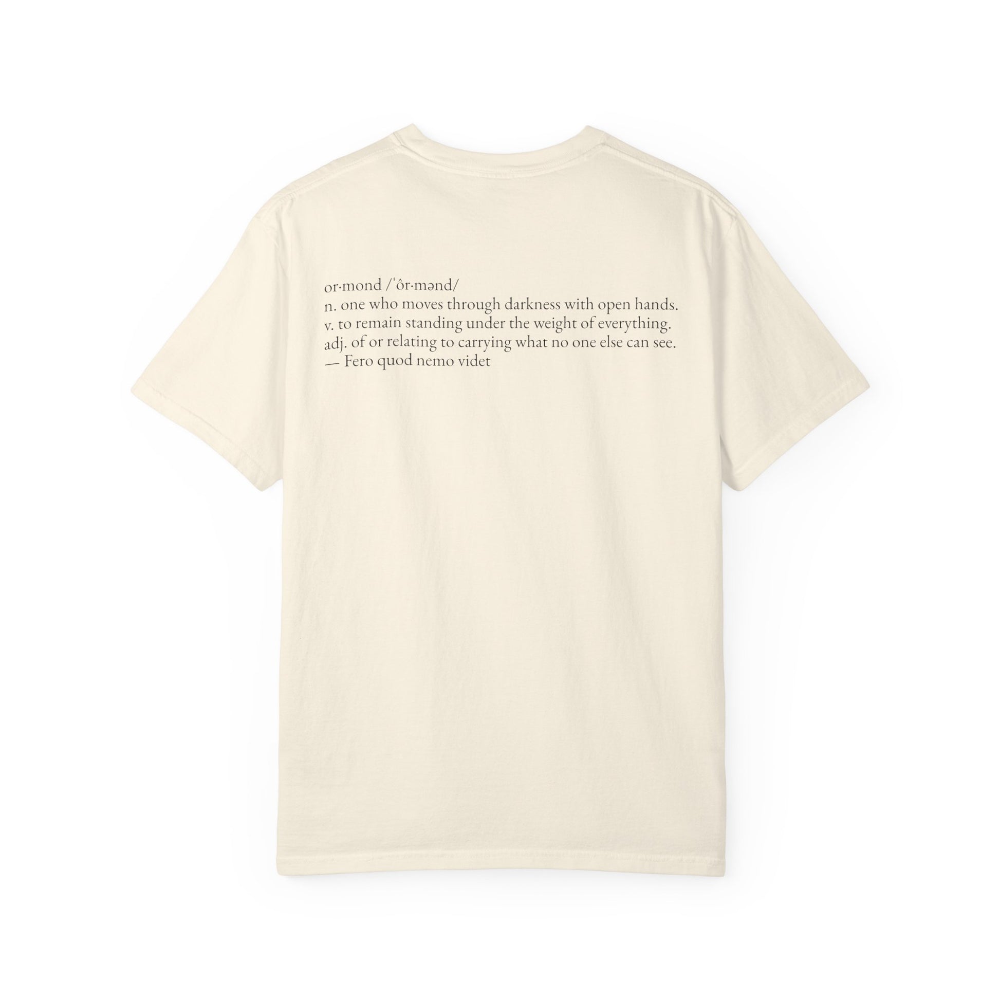 Printed on a garment-dyed, heavyweight cotton tee designed to age alongside the wearer.